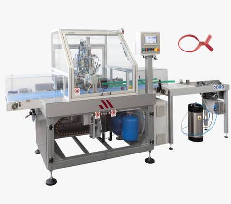 METCO A104LAT Automatic twist band applicator for METCO plastic fresh-saver closure on preformed filled bags. Automatic continuous infeed or manual by operator; cycle starts via photocell.