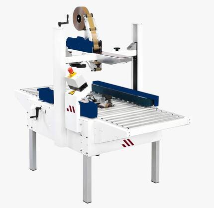 The CT 303 SD is a semi-automatic case sealer compatible with PP and PVC tape, ideally positioned beside a packing station. After the carton is filled, the operator manually folds the top flaps and guides the box into the machine, where the upper and lower flaps are automatically sealed.