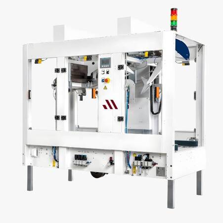 The CT 305 SDRF is a fully automatic carton sealer compatible with PP and PVC tapes. It self-adjusts to varying box dimensions, closes the top flaps automatically, and tapes top and bottom simultaneously—making sealing fully hands-free and highly efficient, with no operator required.